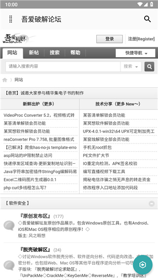 原创发布区、脱壳区、软件调试区、移动安全区等。