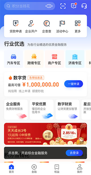 1、进入软件【首页】之后,我们可以看到一些常用的功能,如贷款申请、企业开户等。