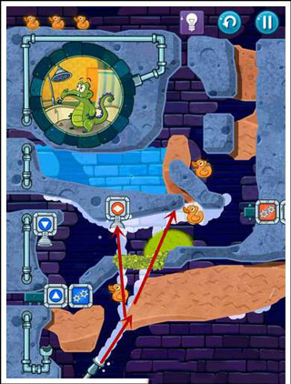 过关难点:这一关的难点就是两只鸭子和红色开关不在主线路上,在划泥土的时候要分流两部分。