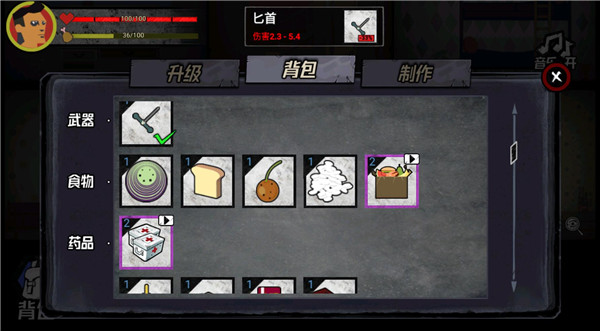6、搜集到的所有的武器装备都在背包里,包括武器、食物、药品等