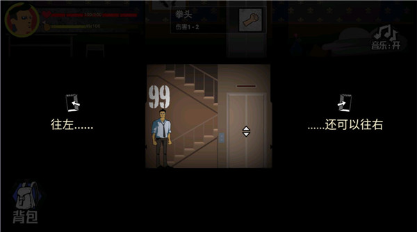 2、可以向左或是向右探索,每次进入一个房间都会消耗一个饥饿值,当饥饿值消耗完毕时,则会通过抵扣两个生命值来抵扣一个饥饿值