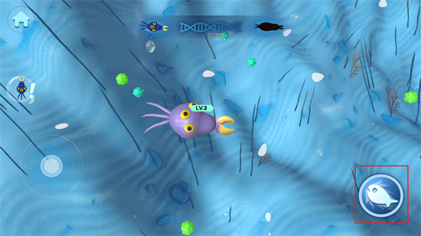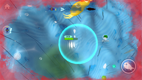 游戏玩法也十分的简单,玩家可以通过摇杆来控制细胞来移动,再配合右下角的按键还可以帮助玩家控制细胞快速移动,帮助细胞来捕捉比自己等级低的细胞,还可以通过按键来逃离比自己等级高的细胞。