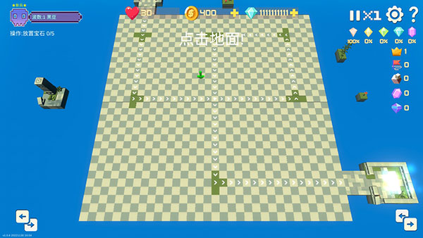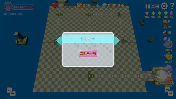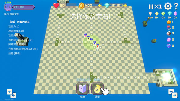 1、每波开始前,放置5颗随机宝石,放置结束后选择其中一颗留下,其他宝石将变为石头,可用作摆放迷宫。