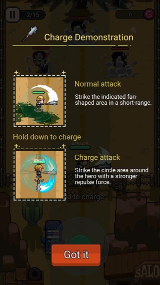 2、游戏战斗相对来说比较简单,在选择完技能后,拖动下方的虚拟摇杆便可进行移动,松手后便可自动攻击,其中攻击的方向在地图上有箭头指标,类似打球一样的击退方向,可以合理控制来起到“隔山打牛”的一击必杀效果。