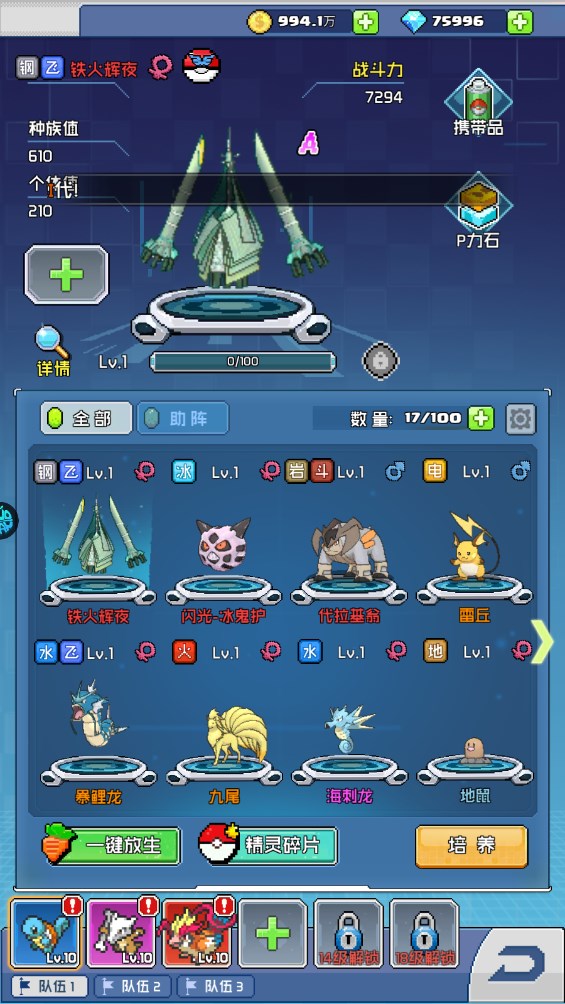 8、点击上方的精灵背包还可以搭配不同的精灵,也可以进行一键放生。