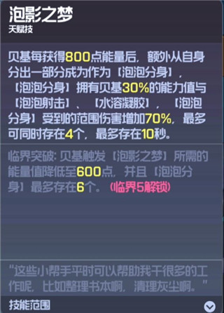 最后是天赋技能,消耗800能量,召唤分身进行协同攻击,分身享有本体30%属性与普攻,伤害技,场上只能同时存在四个分身。但是要注意,范围性伤害会多给分身造成70%的伤害,并且本体死亡后分身是不能存在于场上的,而且分身不继承大招。这个技能非常好用,召唤出来的分身不仅可以提高输出,还可以挡伤害,减轻aoe生存压力