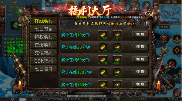 3、当玩家达到在线时长可以领取海量资源