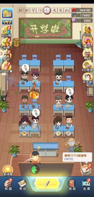 5、特殊事件:上课过程中也会出现一些特殊事件,如果校长们处理得当,也会有不错的收获呦~比如面对想要上厕所的学生点击马桶图标,即可获得十朵鲜花。而面对打瞌睡的学生,适当地给他一粉笔,在让他清醒的同时,校长也会收到相应的学费和心得奖励~