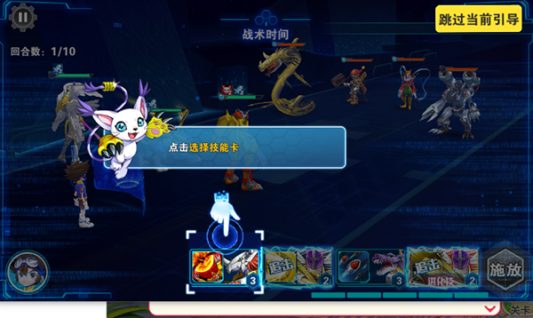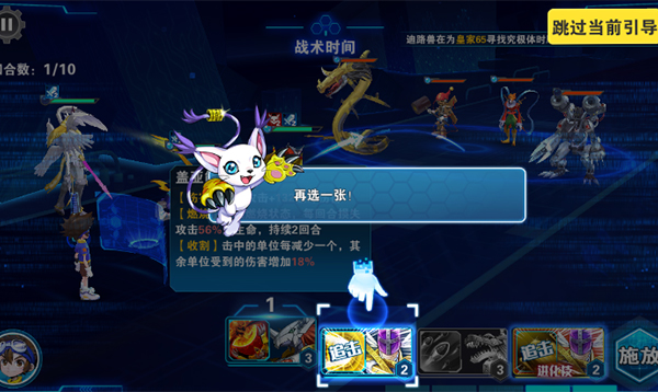 3、进入战斗后,数码兽会自动攻击,每次攻击都会积攒能量,满能量后可以选择技能卡,释放强力的数码兽技能,还有几率刷新进化技能,进化数码兽释放更强技能。