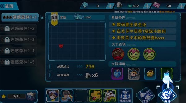 1、游戏以策略玩法为主,玩家需要先搭配好数码兽阵容,让战斗力最大化。