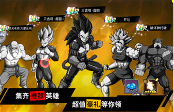 7、充值比例1:500!上线送8级Z战士,送10万充值、顶级UR贝吉塔·超蓝、百连抽、648养老金x100、超赛材料包