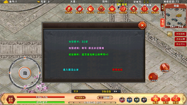 2、右下角四个魔瓶分别为回血,回蓝,随机传送和回城。