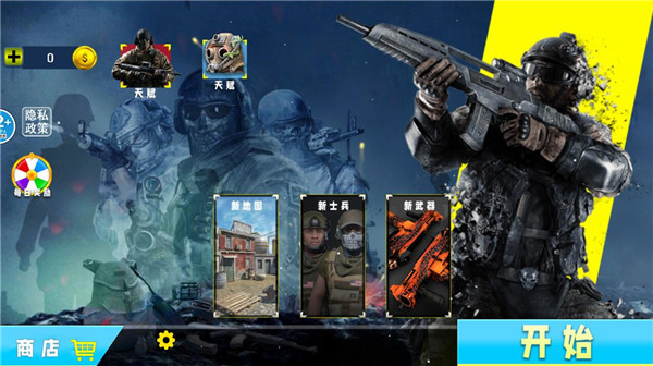 1、打开游戏,在游戏开始前可以先选择新的地图、还可以切换不同类型的士兵、不同武器的选择,选好后再点击开始