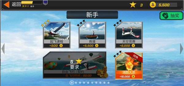2、这里有多种飞行任务,有起飞教学、救援任务、天空竞赛、消防任务等,选择一种任务进入游戏