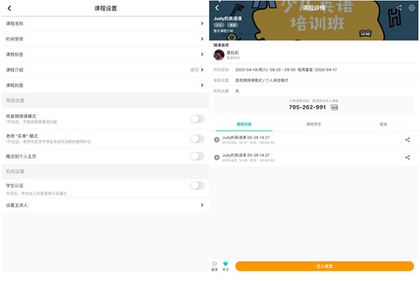 课程相关的内容会展示在课程详情页,包括:课程名称,课程标签,课程介绍,课程封面,授课老师,时间安排,课程类型/费用归属,机构设置,课程码,课程回放,课程学生,留言。