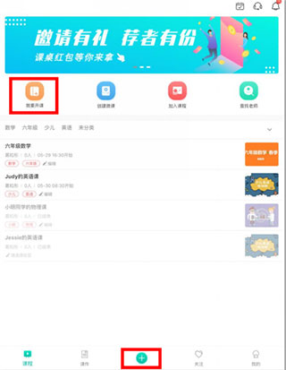 点击课桌App首页“我要开课”/导航栏中间的“+”,可以创建课程。