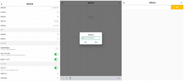 设置方法:打开“课程详情”页面,点击右上角“齿轮”—“编辑”—“课程学生”—右上角“+”,输入手机号或个人 ID 号,方可添加新学生。滑动列表中的学生,可进行删除。