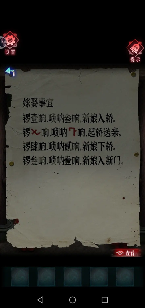 22、点击洗好的拖把和宣传牌,点击宣传牌中新娘的手获得“嫁”字,由拖把有颜色的布条的数量得到顺序白,绿,蓝,红,把顺序代入告示牌上的字,得到密码【婚囍娶嫁】,点击门上的锁,输入密码开门。