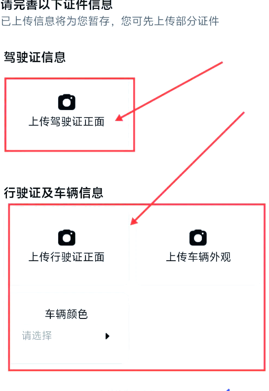 请根据平台要求,上传您的驾驶证正面、行驶证正面、车辆外观照片,并选择正确的车辆颜色。