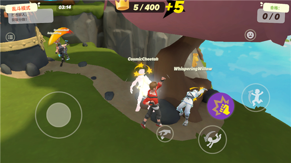 忍者派对手游提供大乱斗等多种模式,同时在地图会刷新不同的武器,如手套、平底锅、蒸汽朋克、吉他等等,玩家需要尽可能的获取它们,它们可以帮助你更好的击打它人,使其它玩家处于晕头状态,让你更好的攻击获得分数。忍者派对手游的武器还拥有皮肤可以解锁使用,内置多个忍者角色可以使用,角色可自定义头发颜色、皮肤颜色,支持搭配角色局内动画和表情,在局内可以使用。