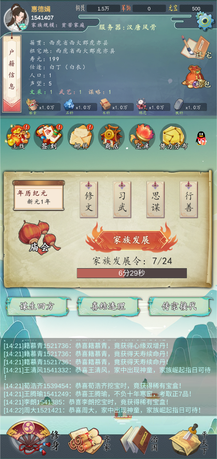 14、门客,可以招募一些门客来辅佐家族了,门客分为3类,文师、武师、谋师,各分普通、高级、神级三个等级。可给任意族人配备,在家族发展时,对应增加族人属性。还记的第一天签到给的神级文师吗,在修文界面给自己配上吧!