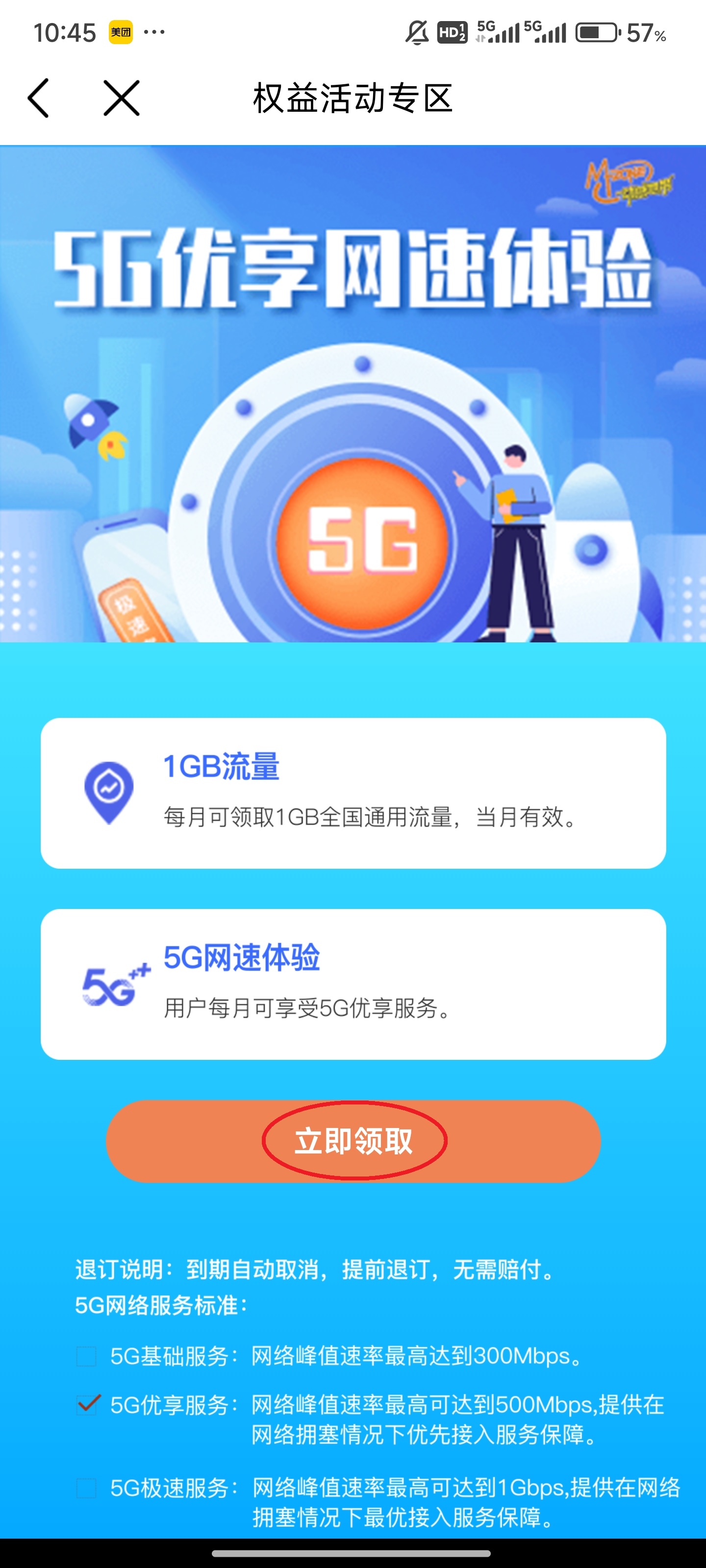 7、回到第五步,点击“1G流量”,随后点击“立即领取”,就完成了流量的领取。