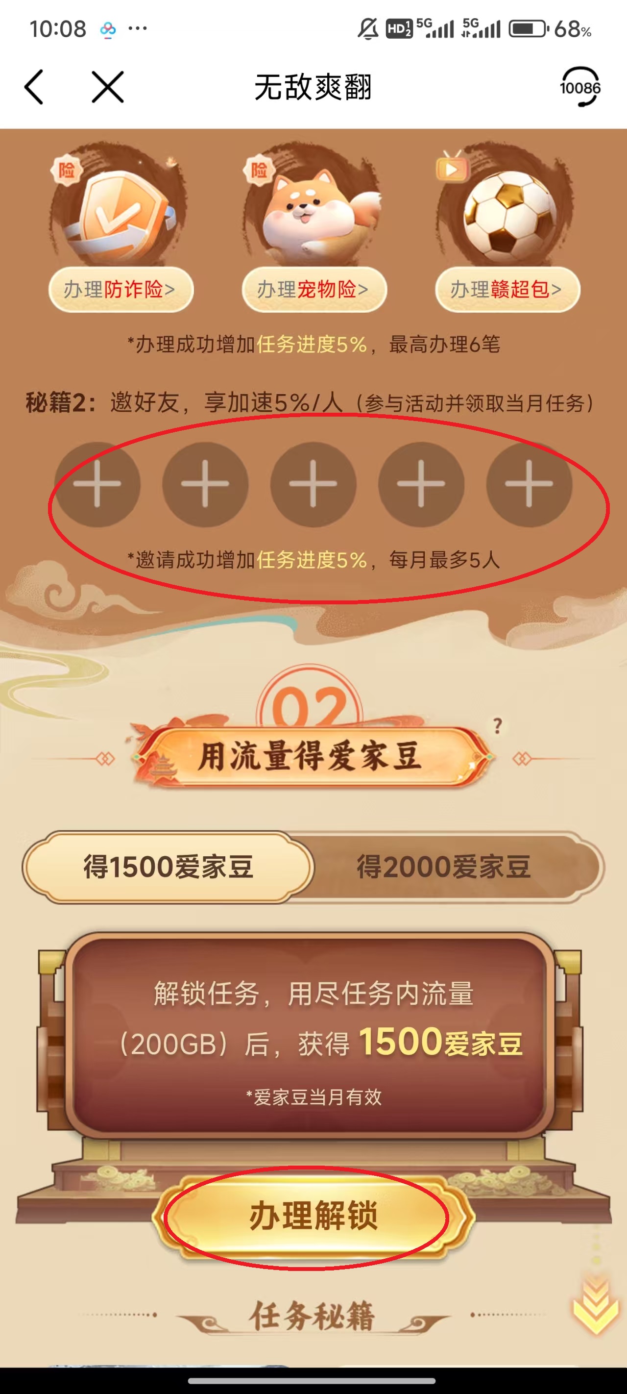 4、将页面向下滑动,可以看到,邀请好友,每个好友增加5%进度,最多五个好友;也可以选择点击办理最下方的中国移动云盘的套餐,实测免费。