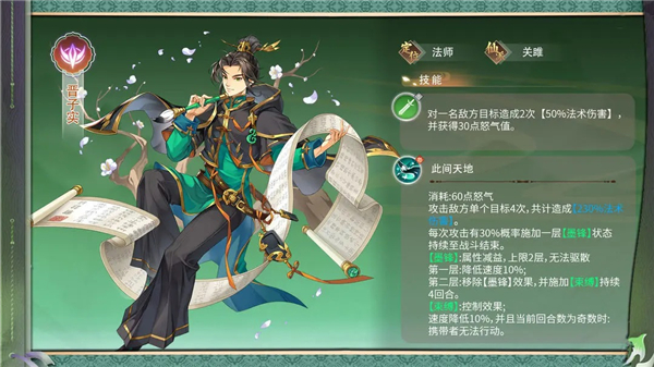 晋子实:阴属性法师职业,来自关雎门派,技能带有控制效果,擅长削弱敌人。