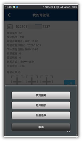 5、然后在弹出的悬浮菜单中,选择其中的一种添加照片的方式,如打开相机现照,或者相册选取已经照好的驾驶证照片。