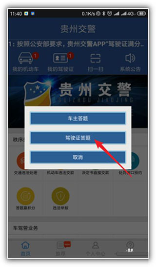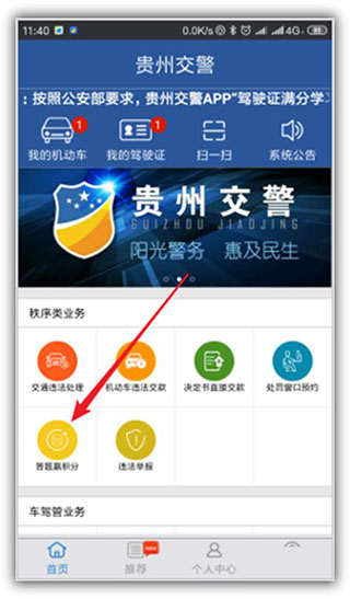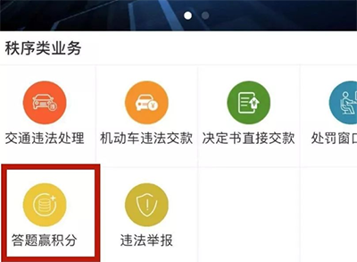 1、打开“贵州交警123App官方最新版本”,找到秩序类业务中的【答题赢积分】点击进去。