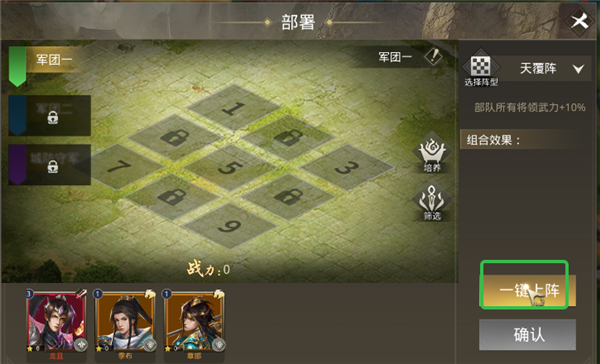 2、点击一键上阵。