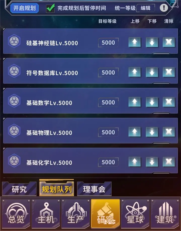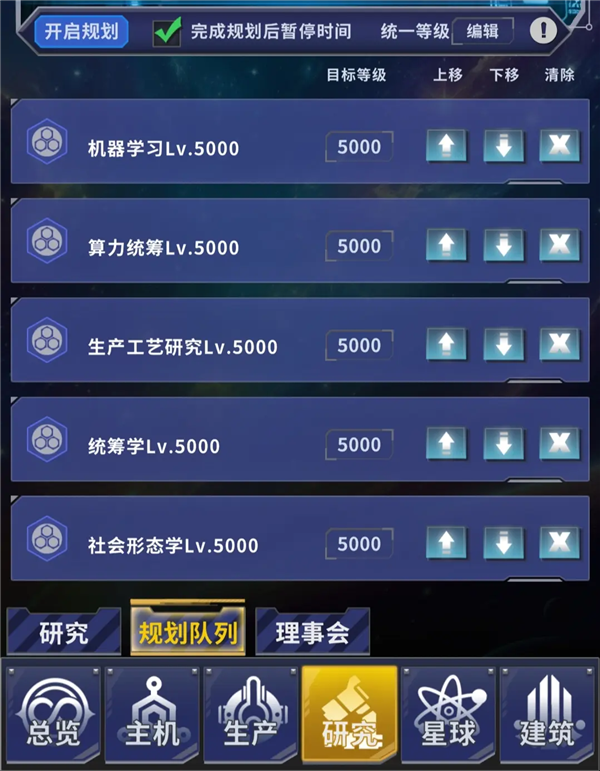 感谢羁池鱼大佬的提点。用法如图所示,顺着排列这十项研究即可。开局使用研究的自动晋升,设定等级800,升到四大类最后一项后转为规划队列,通过多次修改统一等级的方式解放双手。