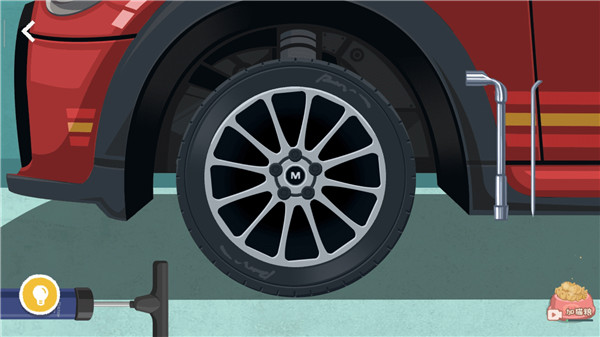 6、最后用左边的打气筒给车胎打气,即可成功通关。
