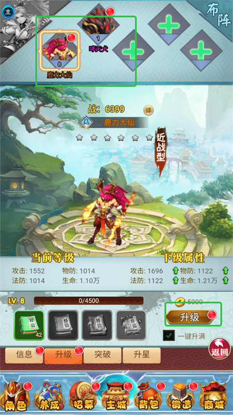 4、随着关卡的深入,玩家需要为各角色卡牌升级,提升阵容整体战斗力。