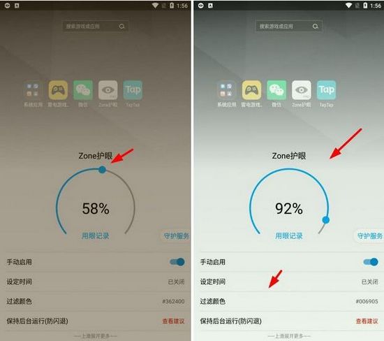 这个其实要看个人喜好的,小编无法给出最合适的配置,例如小编角色58%是让自己眼睛最舒服的配置,而小编的同时则是认为92%+绿色才是最舒服的模式,所以想要最适合的配置,还是需要用户自己去zone护眼app中进行调试。