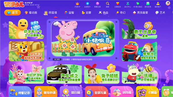 银河少儿电视端还提供益智、热血、百科、启蒙、艺术、奇幻、玩具、儿歌、看动画、学英语等多种频道,涵盖中国、日韩、欧美地区动漫,如奶龙、小猪佩奇系列、贝乐虎之成长故事、汪汪队大救援等等,满足多样化需求。
