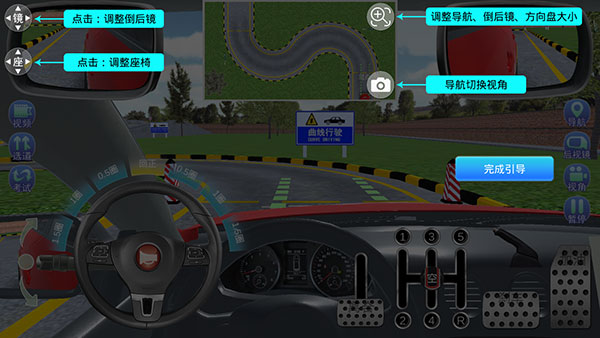 4、正式开始练车之前,还会有一段操作引导教程,点击【完成引导】后即可开始测试。