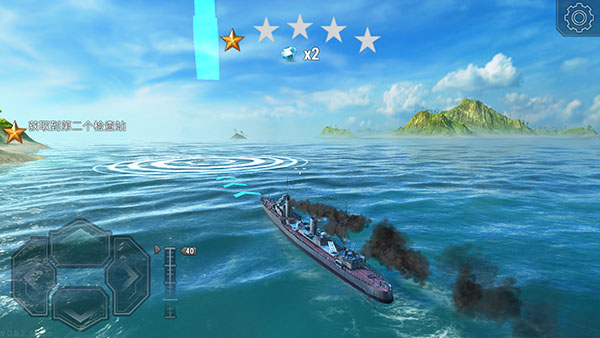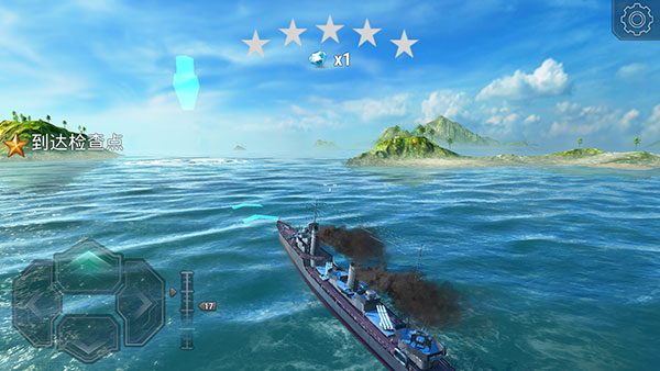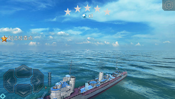 2、第一个目标使到达检查点,这个比较简单,点击左下角的前进按钮,战舰就会自动加速并前进。