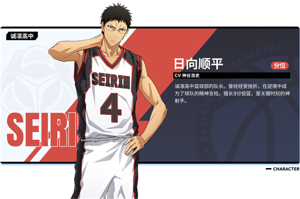 日向顺平-分位 诚凛高中篮球部的队长。他曾经经历过失败,但最终成为了球队的精神支柱。擅长远投,是关键时刻的神射手。