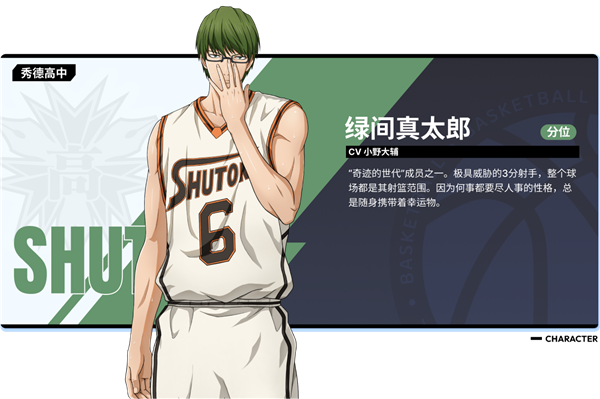 绿间真太郎-分位 "奇迹的世代"成员之一。他是个极具威胁的三分射手,整个球场都是他的射篮范围。因为总是尽力做好每件事的性格,他总是随身带着幸运物。