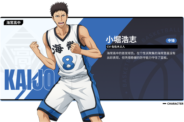 小堀浩志-中锋 海常高中的首发球员。虽然个性独特,但他凭借稳健的防守能力守住了篮板。