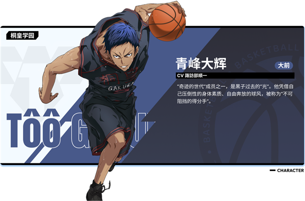 青峰大辉-大前 "奇迹的世代"成员之一,是黑子过去的"光"。他凭借压倒性的身体素质和自由奔放的球风,被称为"不可阻挡的得分手"。