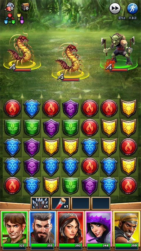 进入某个据点后会显示战斗准备界面,玩家可以配置出战英雄和小兵并使用道具。点击开战进入三消战斗界面,通过消除方块、使用技能和道具来获胜。游戏中的英雄分为五类:自然(绿色)、烈焰(红色)、寒冰(蓝色)、神圣(黄色)和黑暗(黑色)。属性之间存在克制关系:烈焰克自然,自然克寒冰,寒冰克烈焰;光明与黑暗互相克制。