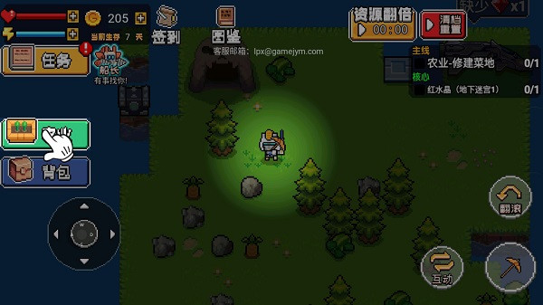 游戏背景:意外坠机荒岛的主人公需要在岛上生存下去,收集资源打造武器,收集宝石修复飞船,最终成功逃出!