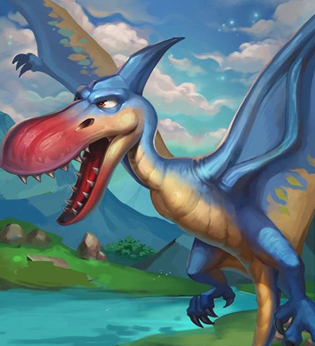 无齿翼龙是是白垩纪晚期的翼龙类,一种飞行的爬行动物,无齿翼龙大约如火鸡一般大小,体重大约15千克,但是它的身长大约有1.8米,两翼开展约8.2米。在游戏中,无齿翼龙张开双翅撩空飞起的样子看起来坏坏的,它可能会滑降水面觅食鱼类。再游戏中属于稀有品质,虽然移动速度较慢,但是他的伐木能力还还有生命星级还是很不错哦,属于平衡属性的恐龙类型,非常值得推荐。