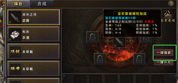 宝石镶嵌 可以在武器和防具上镶嵌宝石,当宝石套装等级满后还能激活额外属性。