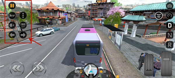 7、进入游戏后就可以操作,下图中为各位小伙伴进行了简单标注,其中D为前进挡,也称驱动挡;N为空挡,暂时停车时(如红灯),注意,此挡位表示空挡,为防止车辆在斜坡上溜动,一定要踩着刹车。R为倒车挡,倒车时用。