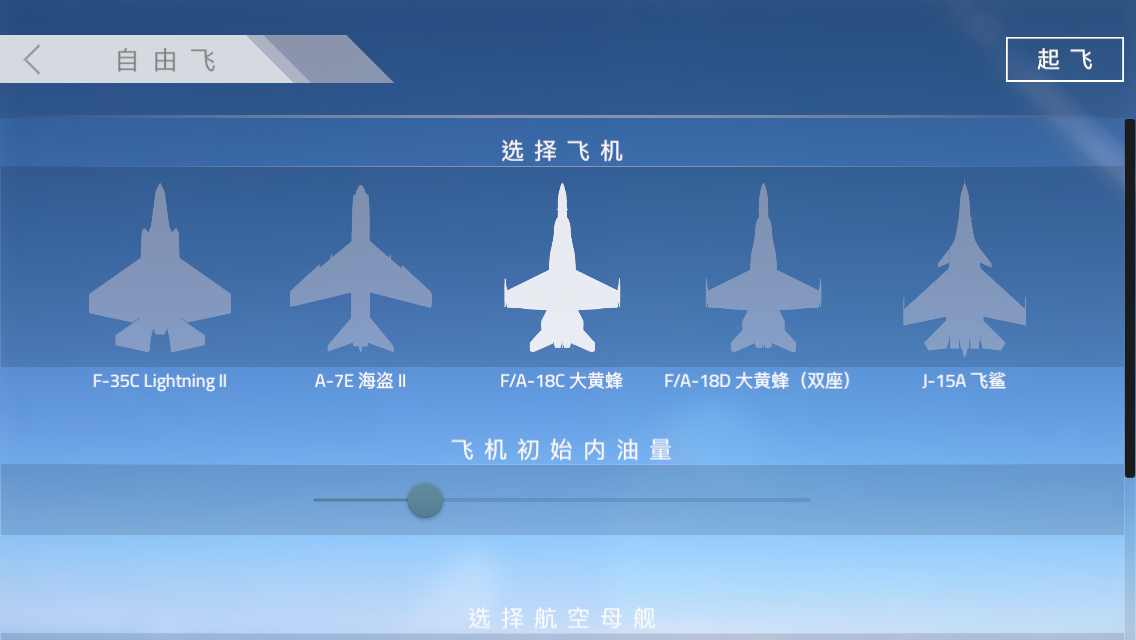 进入菜单后,可以选择自己喜欢的飞机,飞机初始内油量如果在执行降落任务时建议使用 默认油量,因为如果油量过多会使重量增大从而变得不灵活。 然后选择自己喜欢的航空母舰,接下来就是设置出生点,左右滑动可以获取更多出生位置,然后点击起飞即可开始游戏。