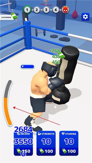 游戏的操作非常简单,不需要复杂的技巧。在训练场中不断练习,努力将沙包一拳打飞,获取金钱来购买更好的装备。然后一步步挑战更强大的专业选手,最终成为拳击王。
