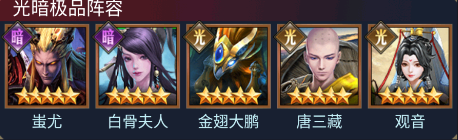 该阵容以光、暗魂系为核心,获得大量的组合属性加成,以蚩尤、金翅大鹏为强大输出,辅以白骨夫人、观音这两大强力的辅助角色,阵容有奶有输出,极其难缠。